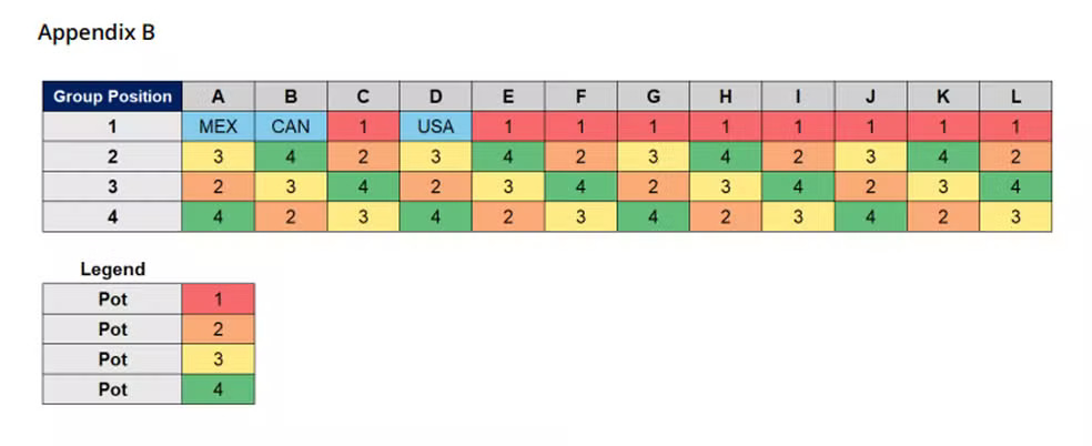 - Estrutura: A ordem dos potes nos grupos segue o padrão oficial da FIFA (ex: Grupo A recebe o Pote 3 na posição 2). Clique aqui para visualizar.